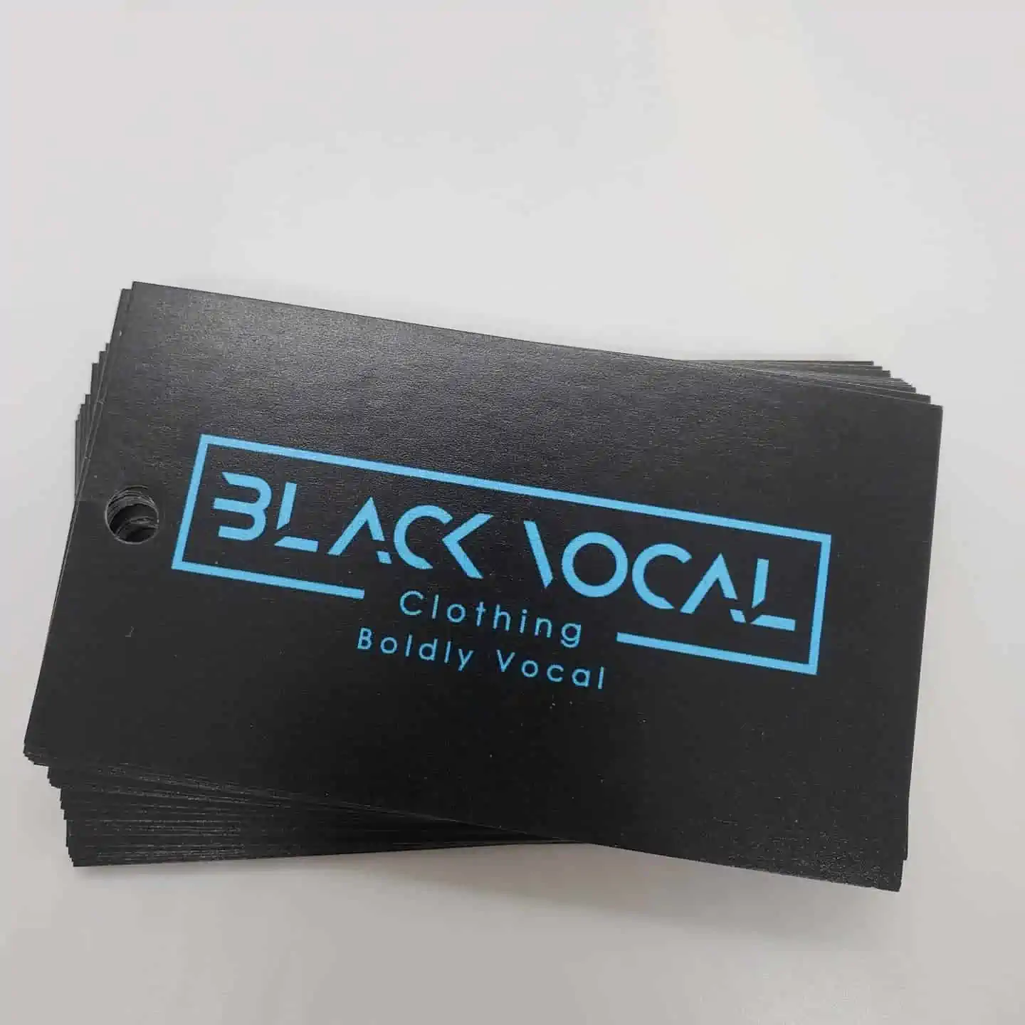 | Hang Tags are great for to accompany your brand merchandise. They can be attached to shirts, pants, bags, or even shoes. Hang tags are printed on 14 pt cardstock. Choose glossy or matte finish. Choose 1/4″ or 1/8″ hole. Choose hole placement of top left corner, top right corner, or center. Please note: strings not included. |